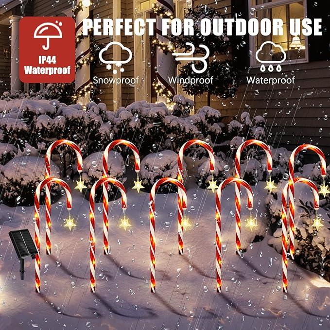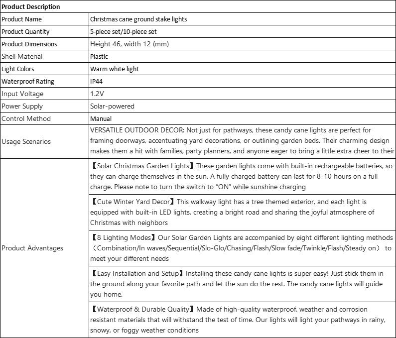 ✨ 5-Piece/10-Piece Set Christmas Cane Solar Path Lights, IP44 waterproof, LED garden ground stake lights. Perfect for festive decoration on sidewalks, courtyards, lawns, porches, etc. These candy lights add a magical touch to your outdoor spaces. Choose between 8 modes for versatile lighting options.