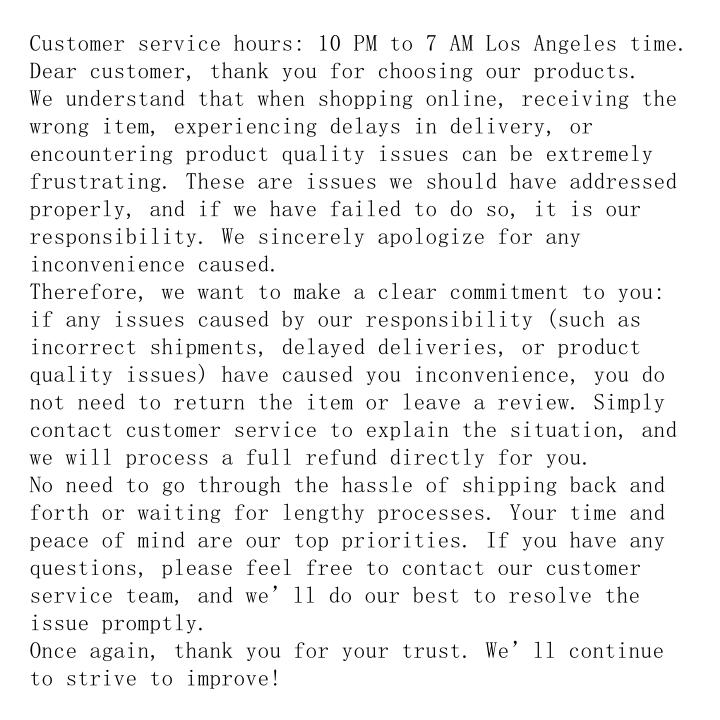 Returns and exchanges are accepted within 7 days with no reason. Returns shipping costs are borne by the buyer. Quality issues result in free returns. Customer service is available from 10 p.m. to 7 a.m. Los Angeles time, including holidays. For after-sales service, apply for refunds or returns on the order page. Upload problem pictures for customer service audit.