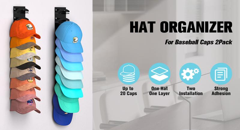 Hat Organizer for Baseball Caps 2Pack, Hat Rack for Wall with Strong Adhesive Hold up to 20 Hats, Hat Hanger Holder Display for Door Closet, Cap Organizer Storage Multilayer Two Mounting Option(Black)